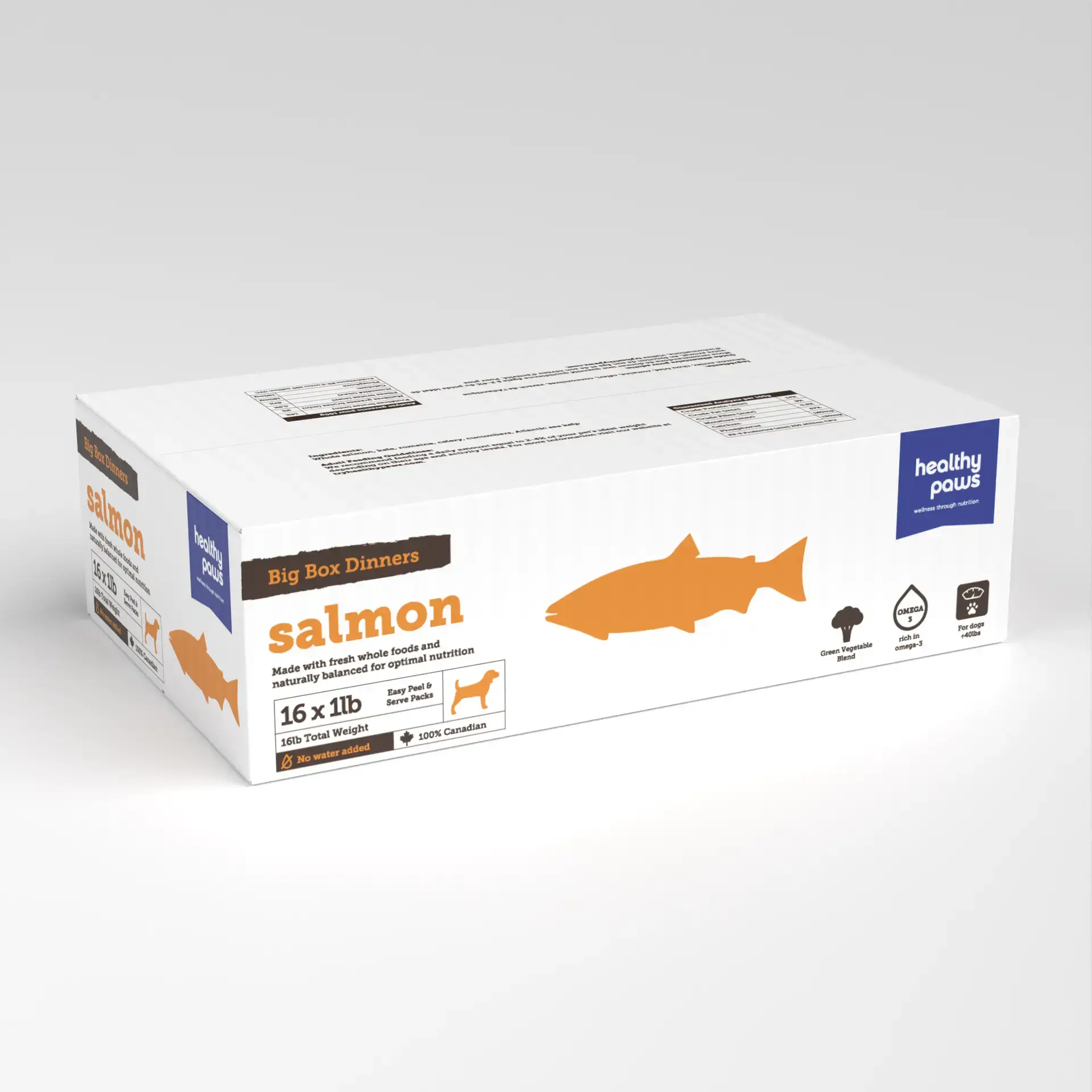 Our Big Box Dinner Salmon contains our Fibre-Rich Green Vegetable Blend and Atlantic Sea Kelp. Single-Grind (coarse texture).